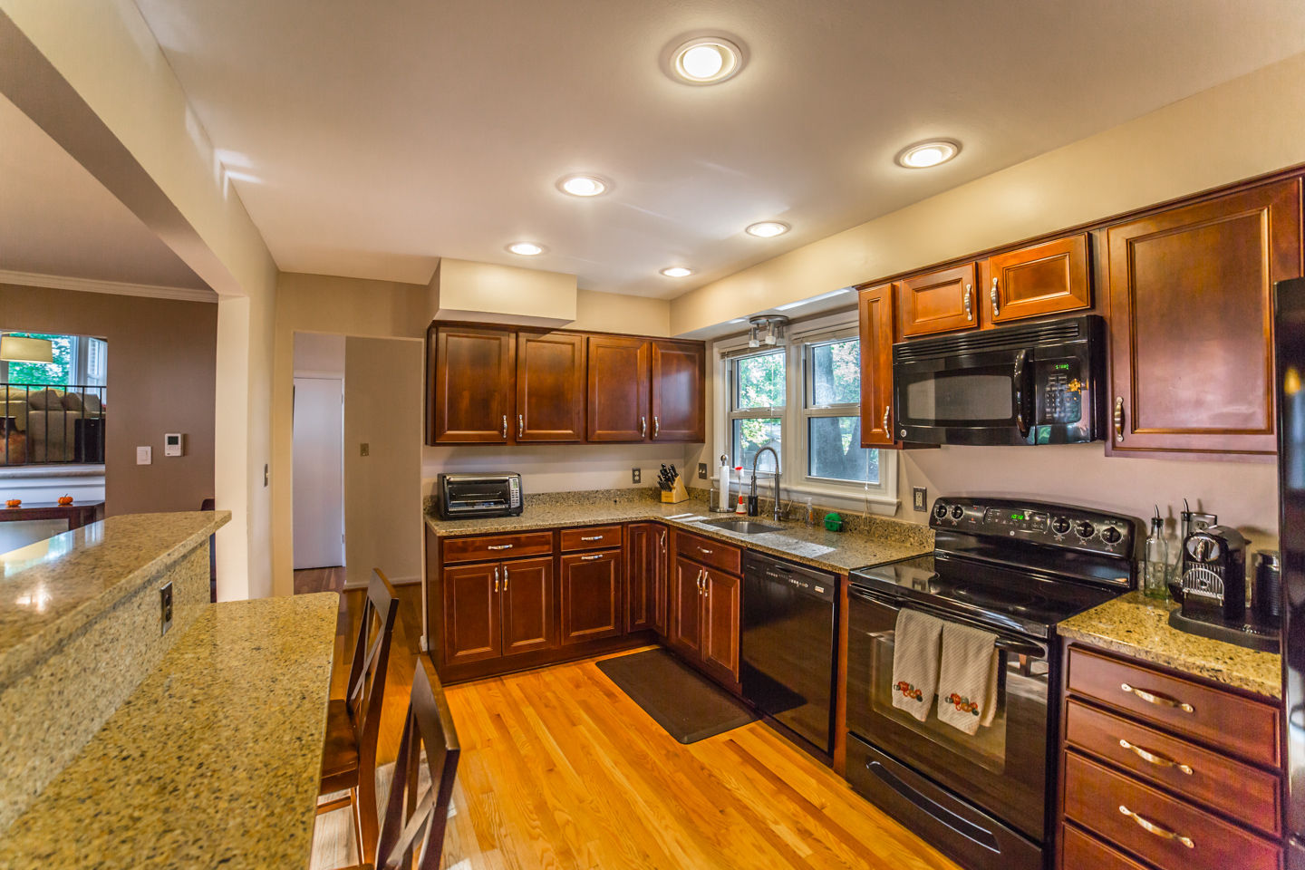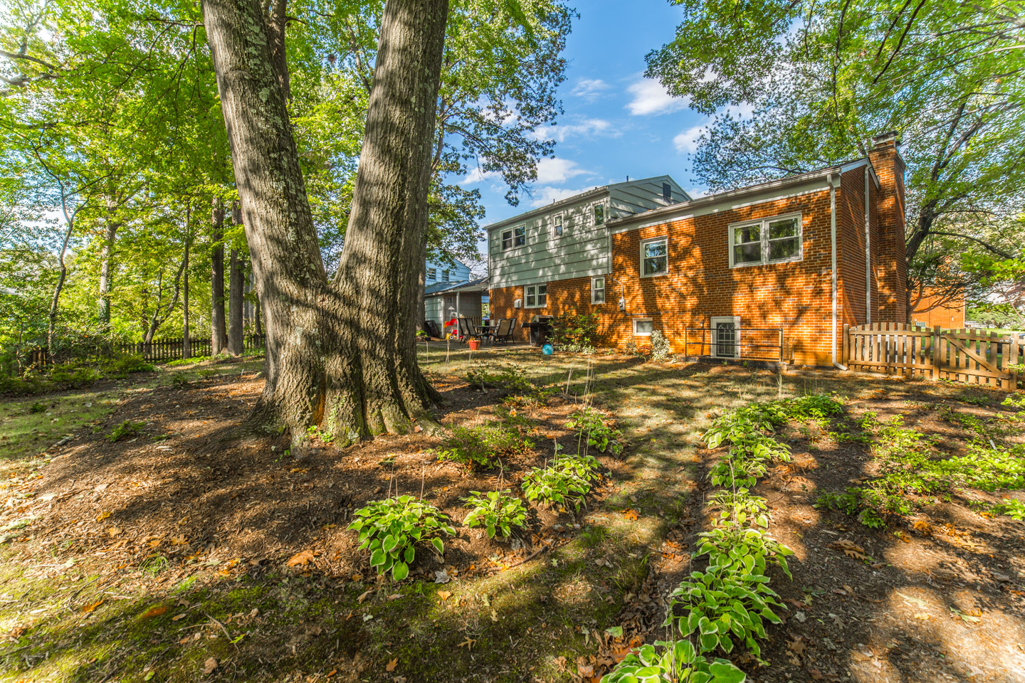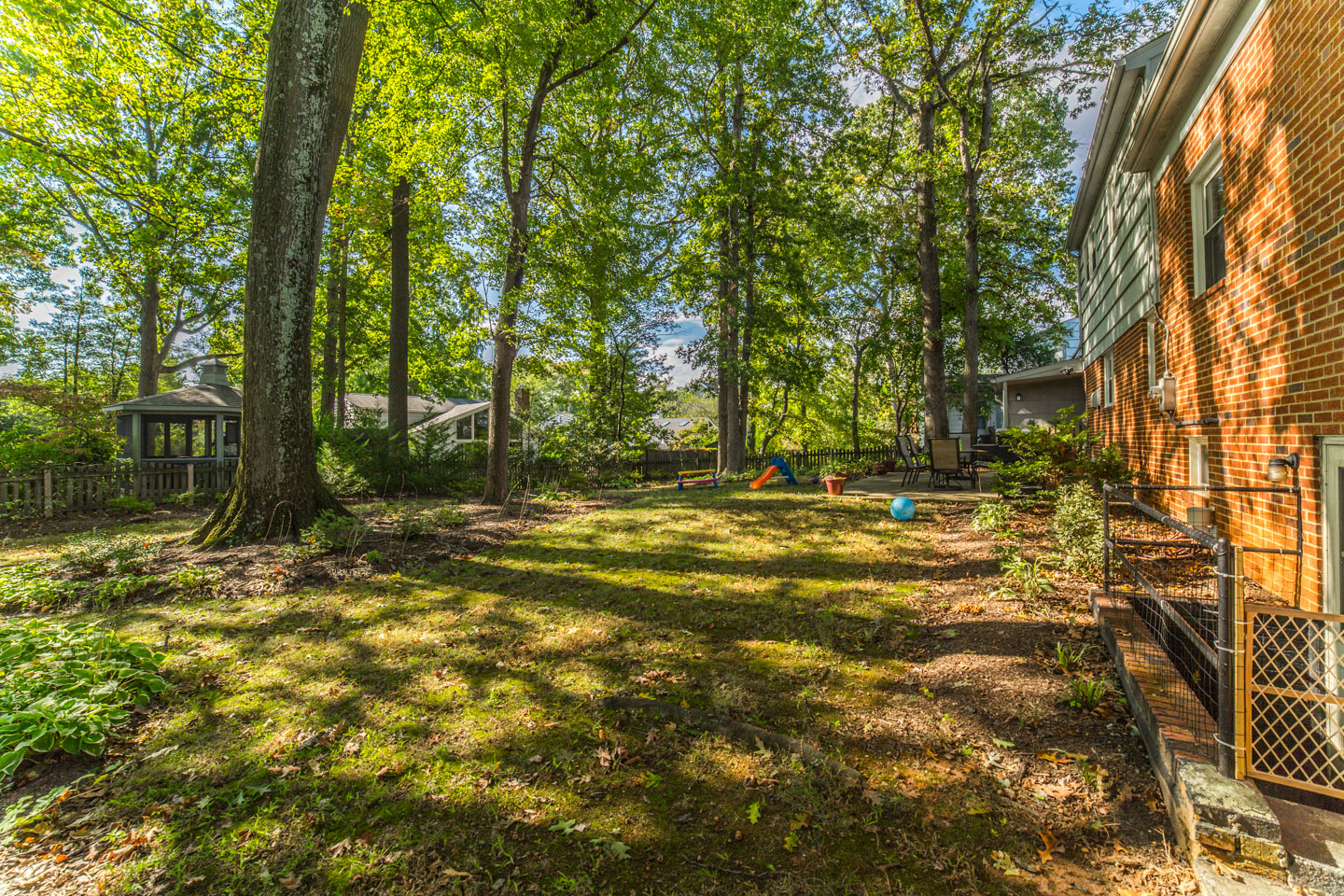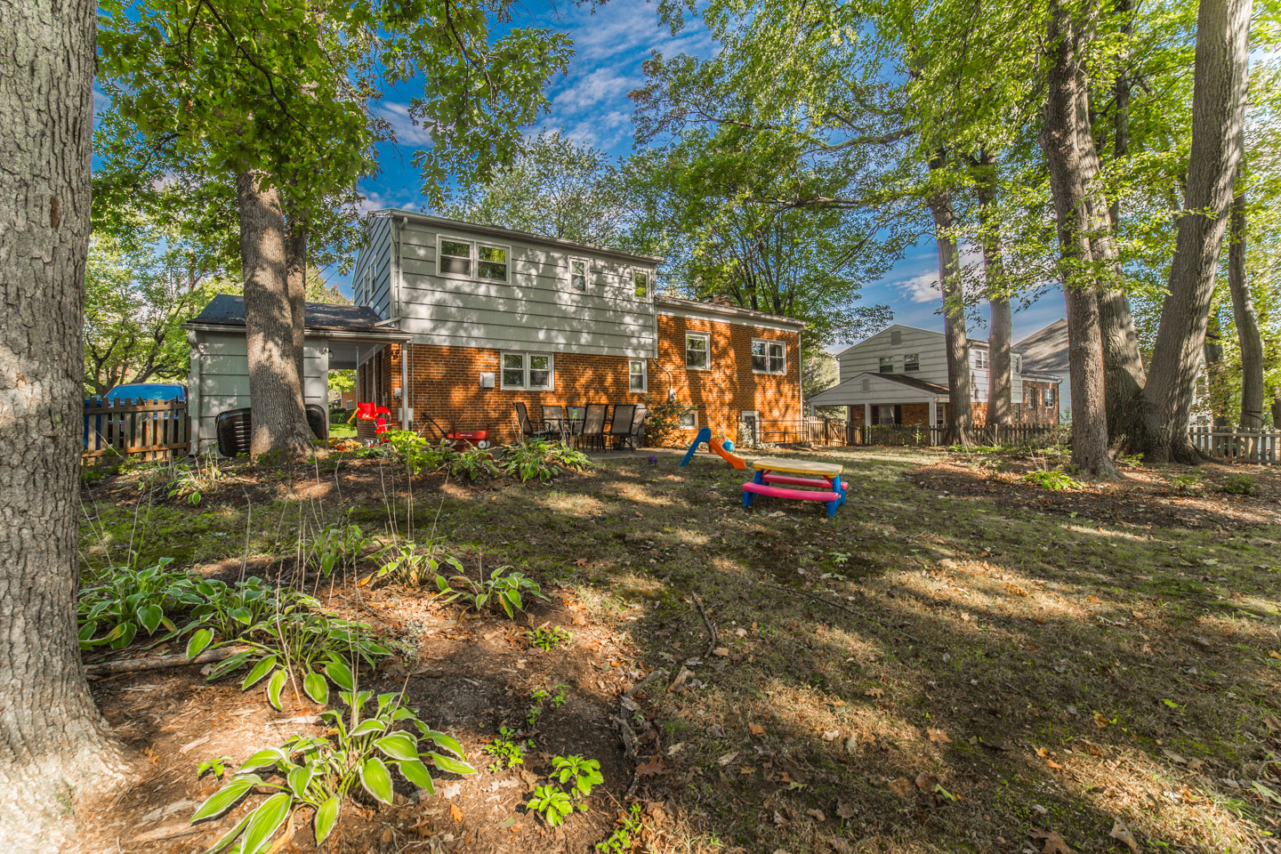 This great split level home in McLean Virginia’s 22101 zip code has a quarter (1/4) acre lot. It is nicely remodeled in the kitchen, bathrooms, and other areas. The kitchen has black appliances, including a built in microwave. Plus there are granite counters, including a great breakfast bar by a cut out into the dining room. There are also wood floors. And a separate entrance to the home into the kitchen from the carport. The dining room feels nice and much more open with the cut out. Plenty of room for a large 8 seater table. There are also wood floors here. Great natural light even in the foyer of this home with a nice large window next to the front door. And the home has a half bath that’s renovated on the main level as well. You have a choice of going up to the living room or down to the rec room. If you go up, you’ll love the high vaulted ceilings and great windows in the living room. Parts of the living room span the whole length of this McLean house from front to back. Plus there is very nice office/den area off the living room. If you go up again you’ll be on the bedroom level with 3 good sized bedrooms and 2 nicely renovated bathrooms. Plus good lighting throughout the house to include recessed lights in the kitchen and lower level rec room. Speaking of which there are 2 fire places, one in the rec room, and one in the living room. The rec room is also a good size. And there is an unfinished utility room that’s great for storage and also has very efficient front loader washer and dryer. The utility room of this split level home has another exterior door out to the back yard. The back yard is spacious, pretty flat, and well landscaped. Plus it’s fenced. Great for keep tabs on little ones or pets.