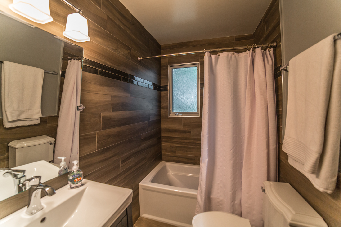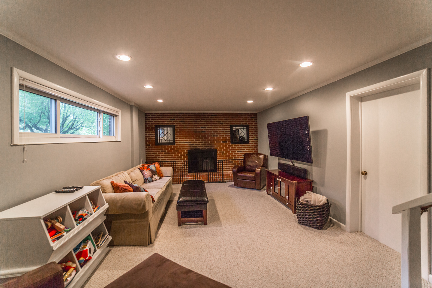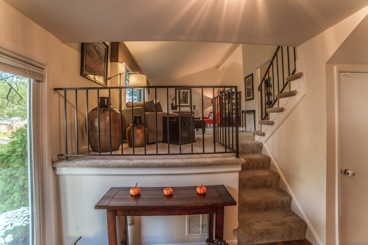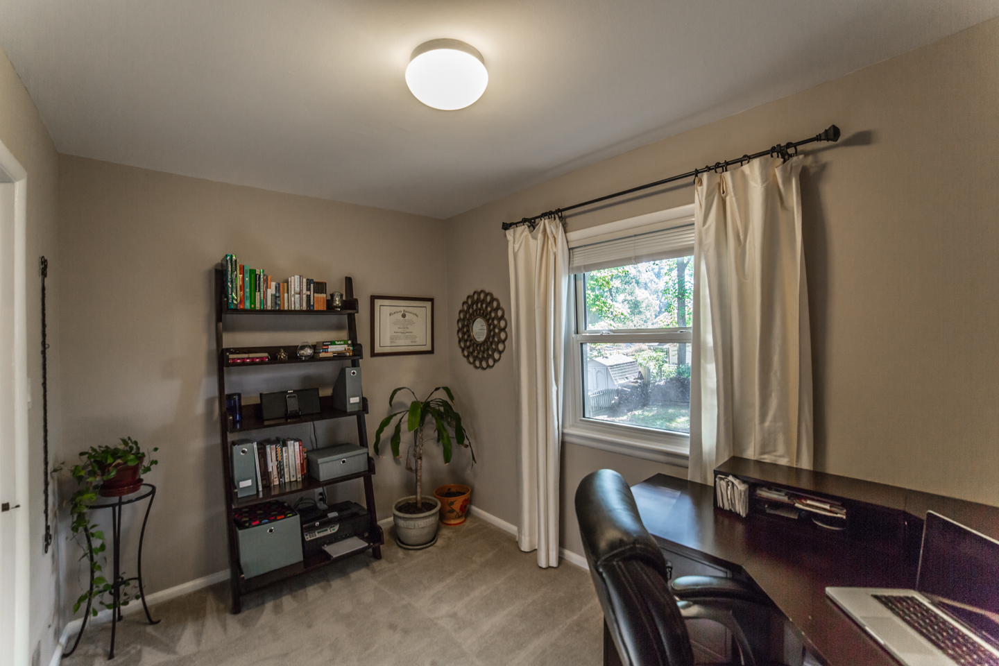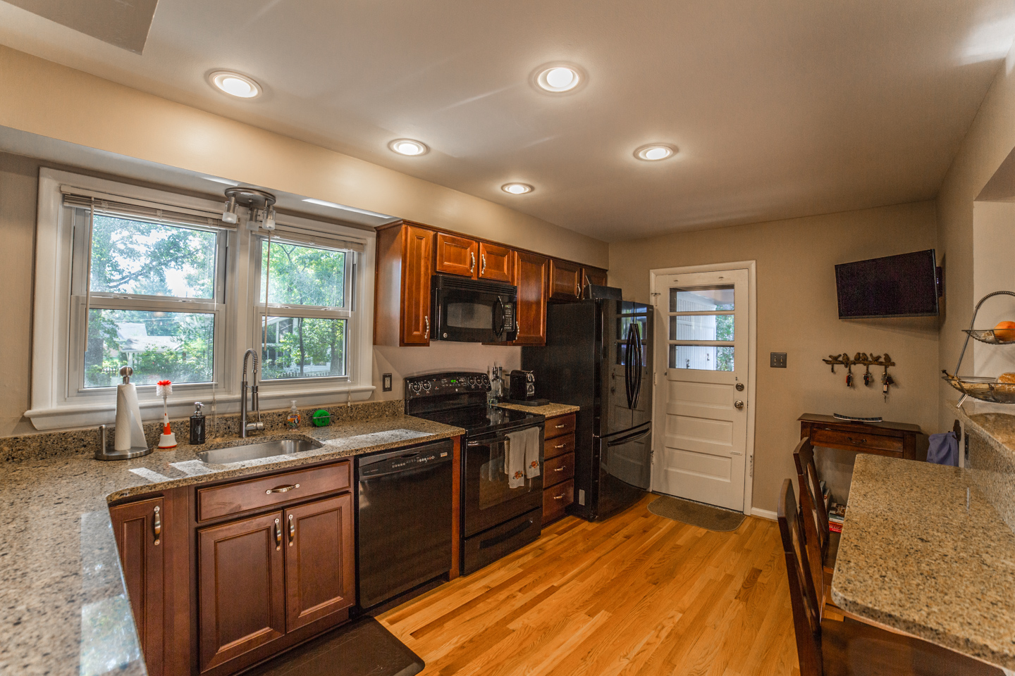 This great split level home in McLean Virginia’s 22101 zip code has a quarter (1/4) acre lot. It is nicely remodeled in the kitchen, bathrooms, and other areas. The kitchen has black appliances, including a built in microwave. Plus there are granite counters, including a great breakfast bar by a cut out into the dining room. There are also wood floors. And a separate entrance to the home into the kitchen from the carport. The dining room feels nice and much more open with the cut out. Plenty of room for a large 8 seater table. There are also wood floors here. Great natural light even in the foyer of this home with a nice large window next to the front door. And the home has a half bath that’s renovated on the main level as well. You have a choice of going up to the living room or down to the rec room. If you go up, you’ll love the high vaulted ceilings and great windows in the living room. Parts of the living room span the whole length of this McLean house from front to back. Plus there is very nice office/den area off the living room. If you go up again you’ll be on the bedroom level with 3 good sized bedrooms and 2 nicely renovated bathrooms. Plus good lighting throughout the house to include recessed lights in the kitchen and lower level rec room. Speaking of which there are 2 fire places, one in the rec room, and one in the living room. The rec room is also a good size. And there is an unfinished utility room that’s great for storage and also has very efficient front loader washer and dryer. The utility room of this split level home has another exterior door out to the back yard. The back yard is spacious, pretty flat, and well landscaped. Plus it’s fenced. Great for keep tabs on little ones or pets.