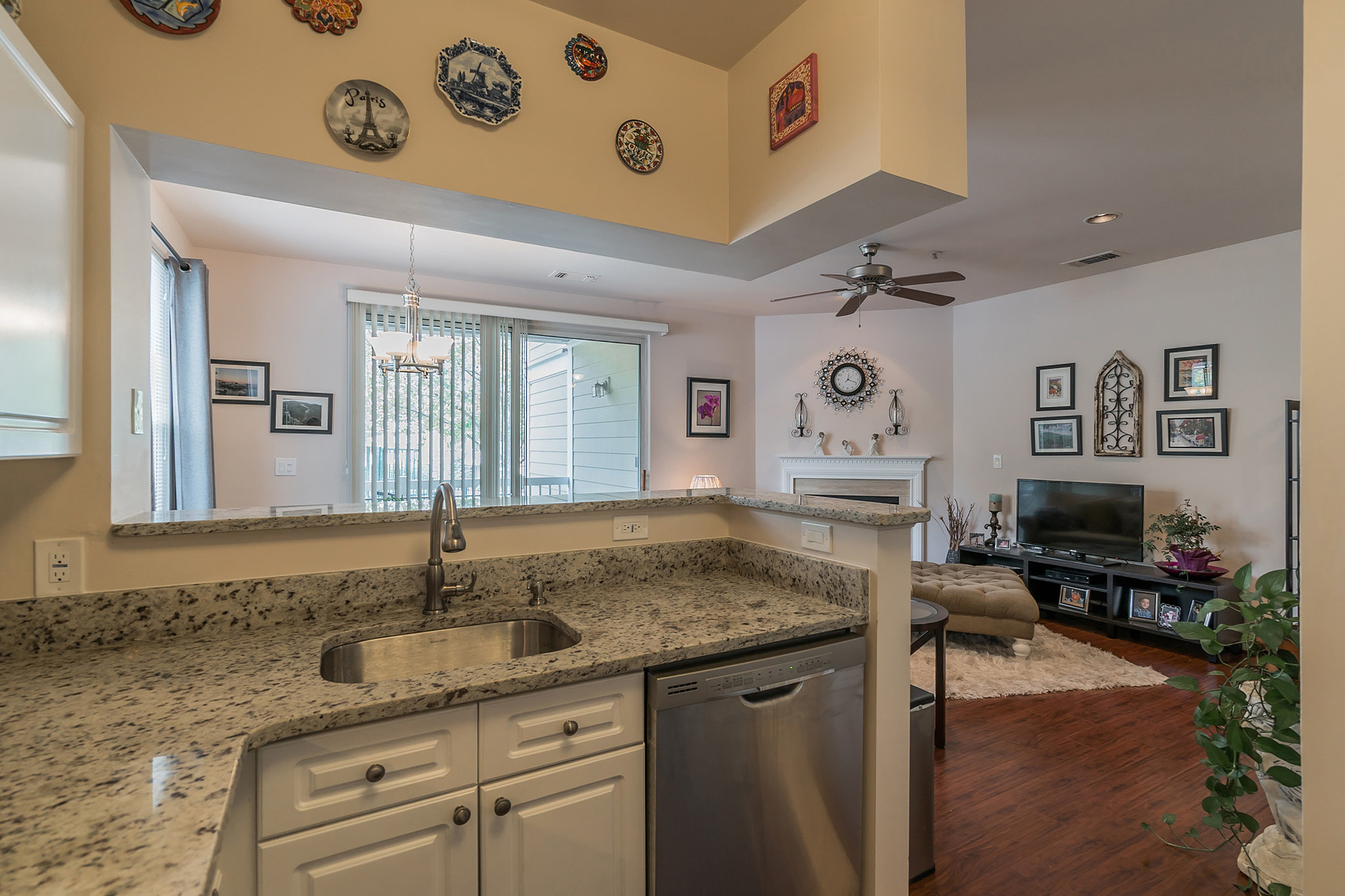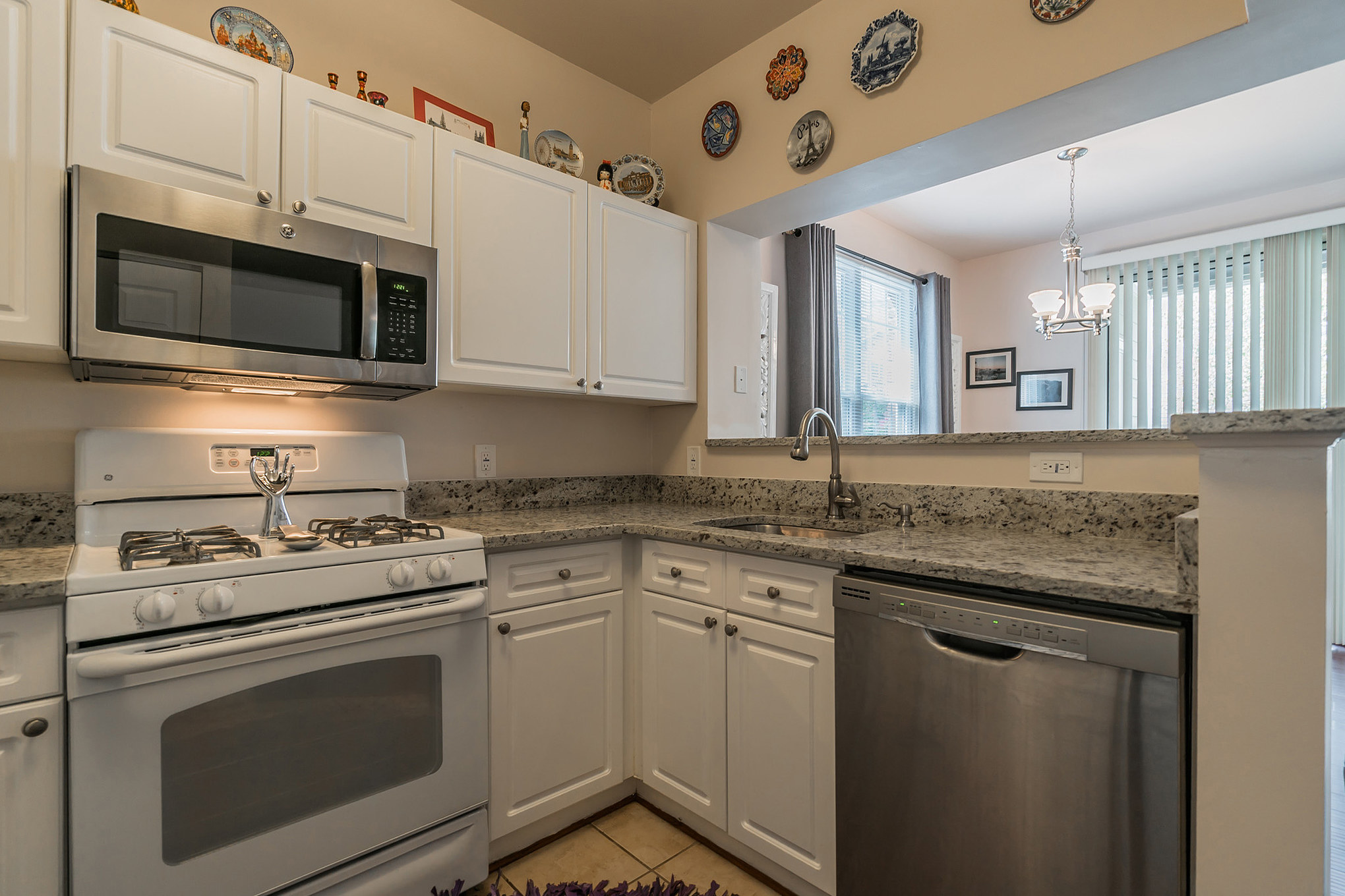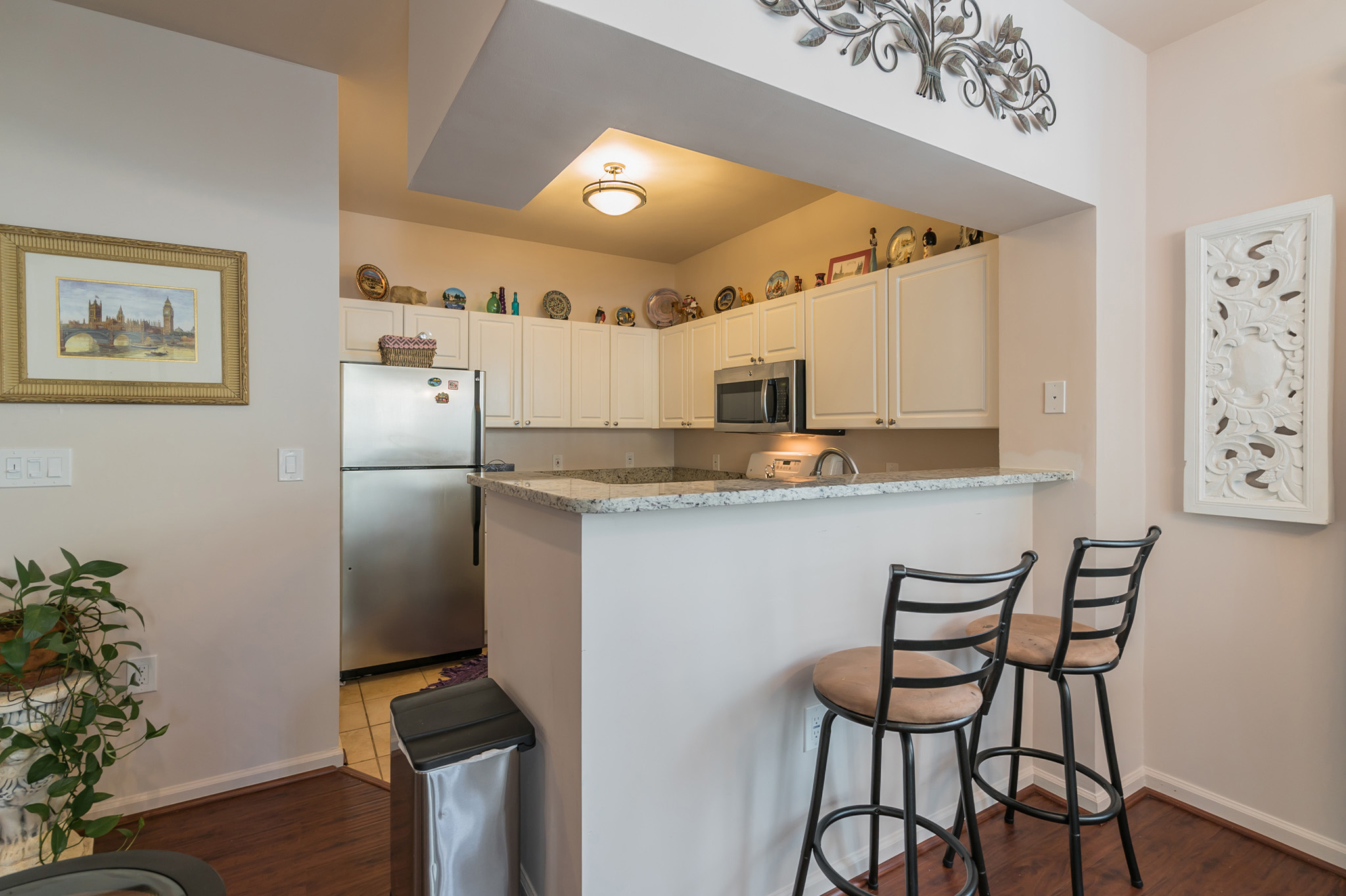 2102 Highcourt Lane #101, Herndon, VA 20170 has just been listed for sale today! It’s a great two bedroom two bathroom condominium in the Worldgate condominium neighborhood. This home has brand NEW granite counters in the kitchen, with an undermount stainless steel sink. There is also a built in microwave. And the kitchen has ceramic tile floors. Plus the nice open floor plan has a breakfast bar from the kitchen opening to the dining and living areas.