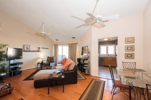 Now available is a top floor, garden condo with an open floor plan. This one bedroom, one bath consists of a large master suite with a sitting room attached. The full bathroom includes a vanity, extra sink and walk-in closet. Living and dining spaces have wood flooring, a fireplace and views to the balcony that overlooks the waterfront’s lake with a dock. Wall to wall carpeting, ceiling fans, stainless steel appliances and vaulted ceilings make up the the remainder of the space in this light-filled condo. New tenants may look forward to the new Bosch front-load washer and dryer in the unit. The community offers a pool and club house, which are both only less than a minute away from this particular building.